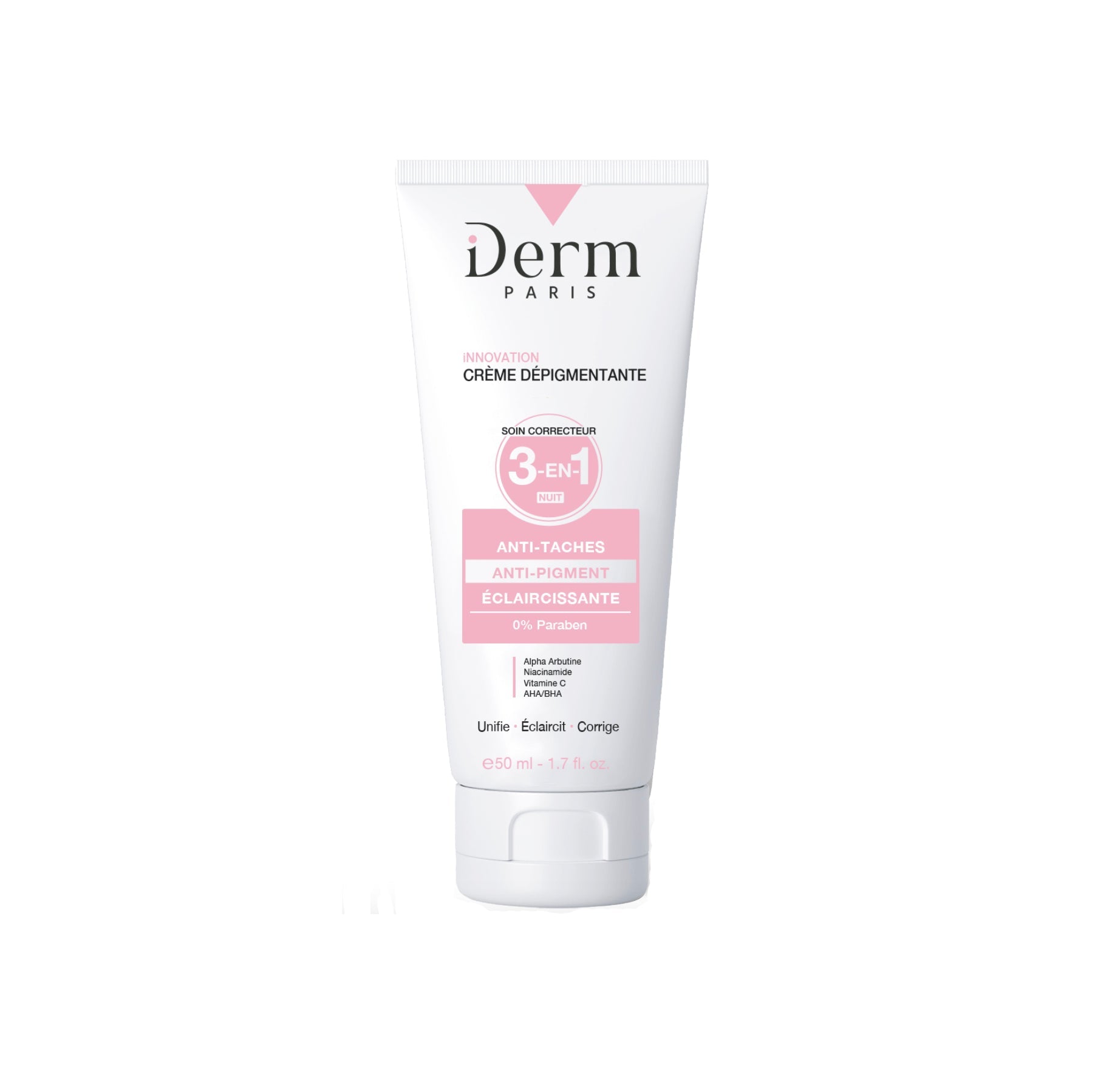 Crème Dépigmentante 3-en-1 Nuit, éclaircissante et anti-taches, enrichie en Acide Glycolique, Acide Salicylique, Alpha Arbutine, Niacinamide et Vitamine C. Elle cible les taches sombres, atténue les marques de post-acné et aide à éclaircir le teint ✨. Sa formule agit en profondeur pour unifier et illuminer la peau, révélant un teint plus clair et homogène avec une utilisation régulière.